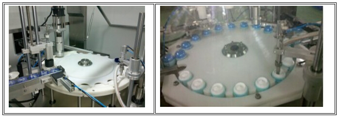 本機主要用于日化的灌裝作業。本機將灌裝、理蓋、下蓋、旋蓋三功能合在一個機體上,全過程實現自動化,適用于化妝品、膏霜類產品、水劑等的灌裝、加熱溫控裝置還可以進行熱灌裝。各部分的試用瓶型調整采用手柄轉動實現,輕松自如,簡便快捷。灌裝方式采用了新型的微壓灌裝,使灌裝速度更快更穩定,所以與同規格的機器相比本機的產量更高,效益更大。本機采用了先進的可編程控制器控制機器的自動運行,光電檢測各部件的運行狀況,所以自動化程度高,操作簡便。在此基礎上,本機變更灌裝設備,可以形成低真空灌裝方式。