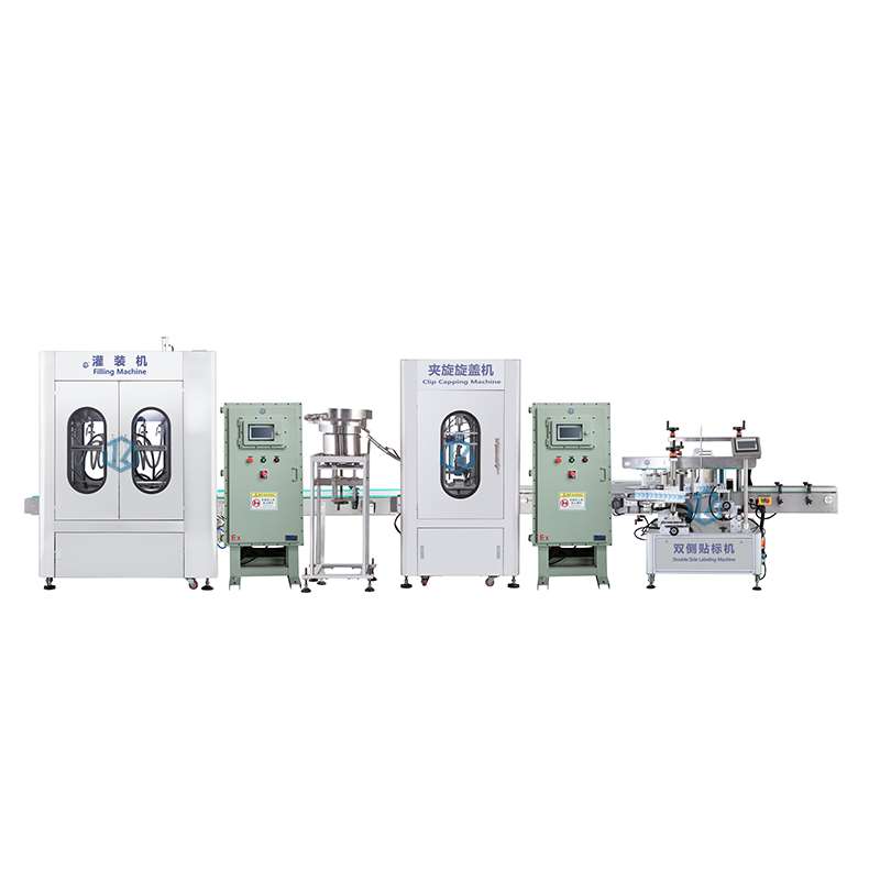 適用各種瓶裝類有防爆灌裝要求的液體包裝產品,如:墨水,防凍液,酒精,冰醋酸等易燃易爆產品,設備集自動灌裝,自動下塞壓塞,自動下外蓋旋蓋,自動單側或者雙面貼標,后面可選擇自動裝箱碼垛。按照要求定制,所有主要電器元件集中放到防爆箱里面,外露電線采用波紋管包住,采用防爆電機。