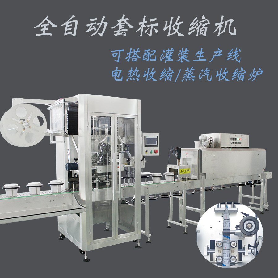 帶模具套標收縮機,該系列設備是集送瓶、分瓶、套標簽、收縮標簽功能于一體的全自動智能型包裝線、真正的高速、精確的定位、人力的精簡、完美的包裝是此設備設計的精神,適用于飲料及健康食品廠,具有美觀、易清潔保養的功能